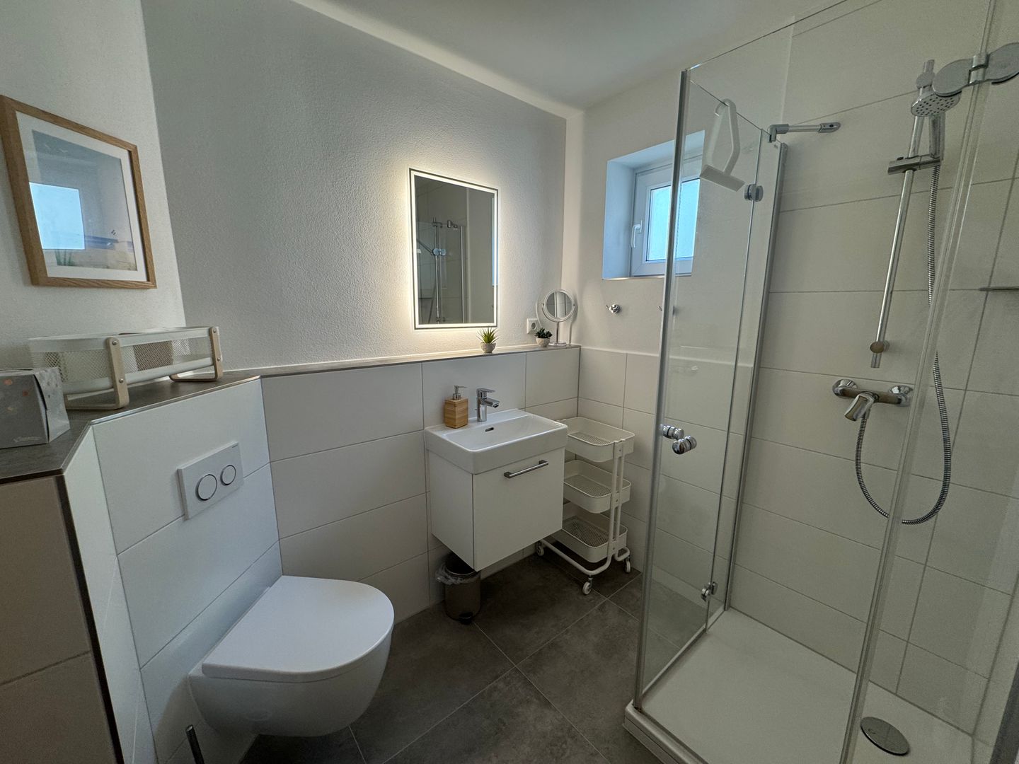 - Badezimmer mit kleinem Fenster und Dusche